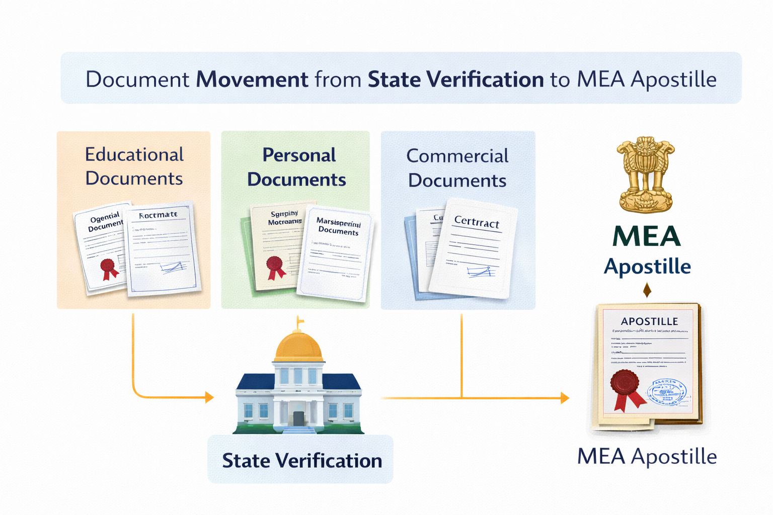 Before submission to MEA, some documents—especially educational and personal certificates—must undergo state-level verification. Once this verification is completed (if required), the document becomes eligible for MEA apostille. Centrally issued documents, such as certain police clearance certificates, may sometimes proceed directly to MEA without state verification.