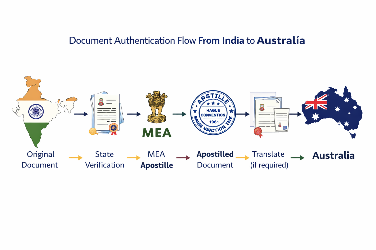 Regardless of the document type, all apostille requests follow the same Australia apostille process, which involves verification and final authentication by the Ministry of External Affairs (MEA), Government of India.